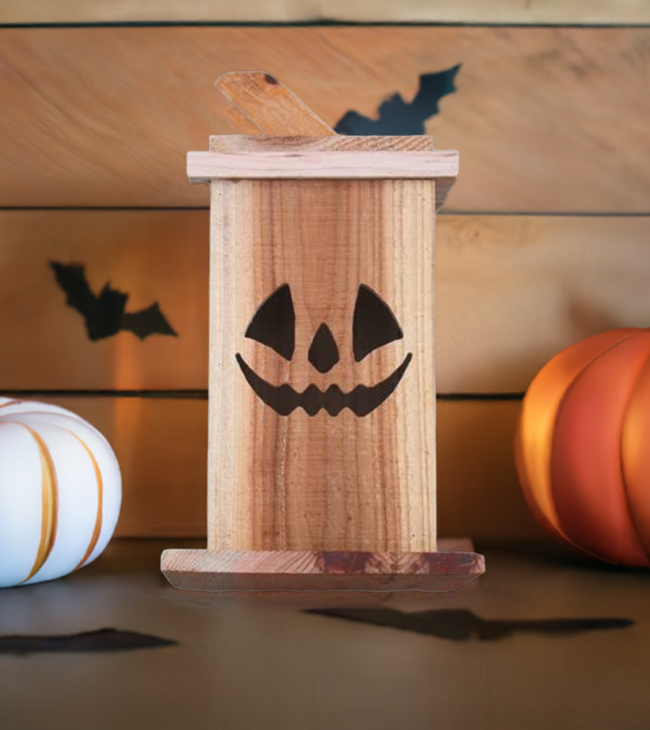 This Happy Faced Rustic Jack-O-Lantern is the perfect addition to your outdoor Halloween decor! Handcrafted from cedar wood, it has been designed for outdoor use and is weather proof. Choose from various faces to make it unique, and light up your Halloween with the included electronic tea light that illuminates when inserted. Add some spooky ambiance to your outdoor space today.